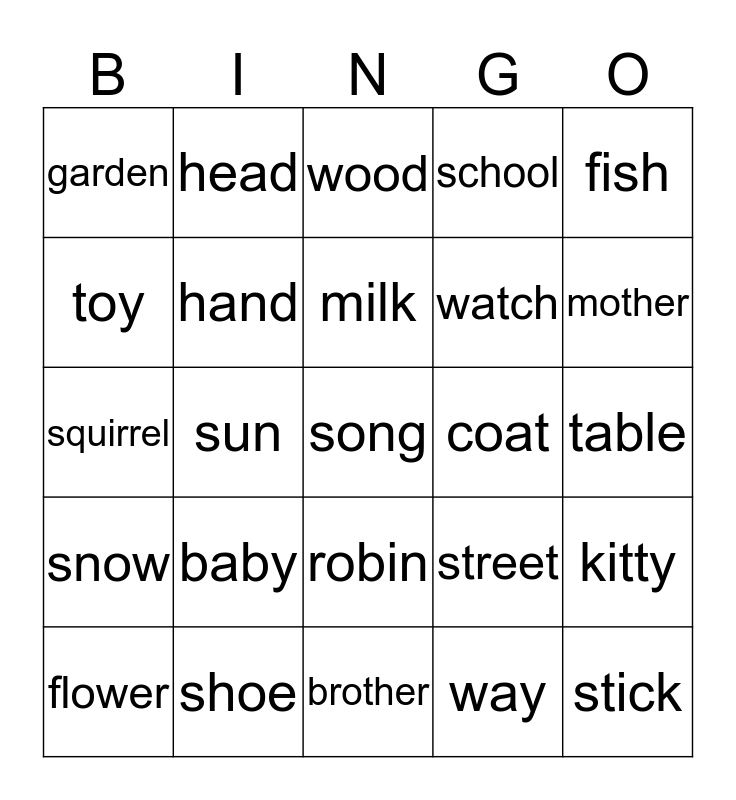 This bingo card has 25 words: baby, brother, milk, flower, fish, garden, toy, head, coat, robin, watch, squirrel, street, kitty, hand, stick, table, wood, mother, sun, song, shoe, snow, school and way.