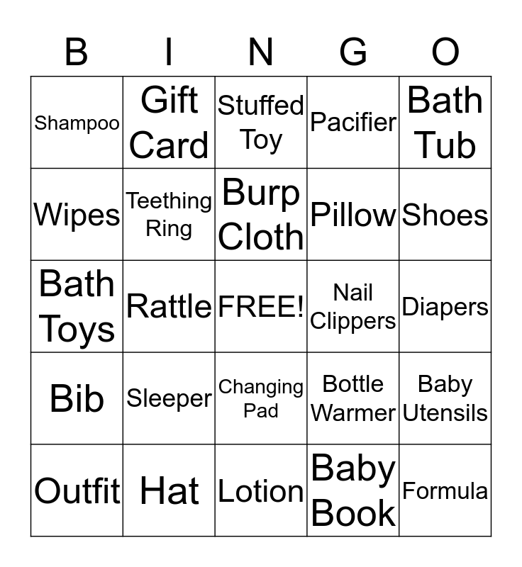This bingo card has a free space and 24 words: Sleeper, Hat, Burp Cloth, Outfit, Bath Tub, Shampoo, Wipes, Gift Card, Nail Clippers, Changing Pad, Pillow, Bath Toys, Bottle Warmer, Baby Utensils, Teething Ring, Baby Book, Diapers, Stuffed Toy, Shoes, Rattle, Formula, Bib, Pacifier and Lotion.
