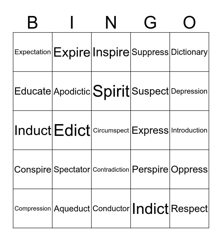 This bingo card has 25 words: Spectator, Conductor, Spirit, Compression, Dictionary, Expectation, Educate, Expire, Express, Contradiction, Suspect, Induct, Perspire, Oppress, Apodictic, Respect, Introduction, Inspire, Depression, Edict, Circumspect, Aqueduct, Conspire, Suppress and Indict.