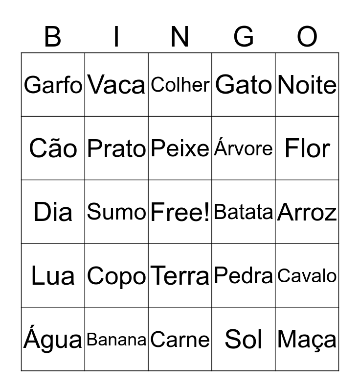 This bingo card has a free space and 29 words: Água, Leite, Sumo, Pão, Garfo, Colher, Prato, Copo, Batata, Banana, Arroz, Maça, Carne, Sol, Flor, Erva, Terra, Lua, Noite, Dia, Pedra, Mar, Árvore, Cão, Gato, Vaca, Cavalo, Peixe and Pato.