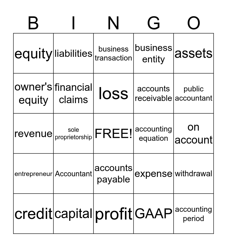 This bingo card has a free space and 25 words: Accountant, profit, loss, credit, assets, equity, owner's equity, liabilities, accounting equation, accounts payable, accounts receivable, revenue, expense, withdrawal, financial claims, property, on account, business transaction, public accountant, sole proprietorship, accounting period, capital, entrepreneur, business entity and GAAP.