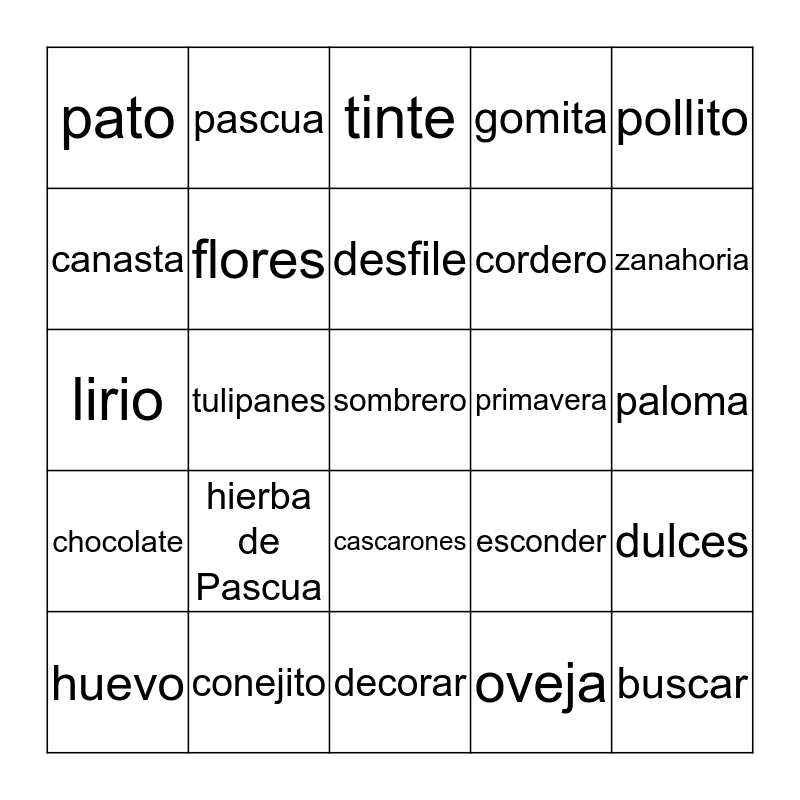 This bingo card has a free space and 24 words: hierba de Pascua, conejito, desfile, huevo, pollito, pato, canasta, pascua, primavera, cascarones, cordero, lirio, esconder, dulces, flores, oveja, paloma, tinte, zanahoria, tulipanes, buscar, chocolate, gomita and decorar.