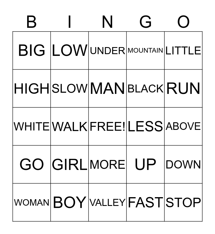 This bingo card has a free space and 24 words: GIRL, BOY, MAN, WOMAN, LITTLE, BIG, HIGH, LOW, LESS, MORE, BLACK, WHITE, UP, DOWN, SLOW, FAST, ABOVE, UNDER, RUN, WALK, STOP, GO, MOUNTAIN and VALLEY.