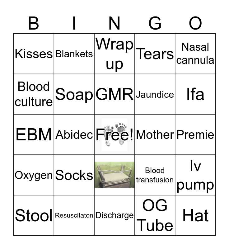 This bingo card has 10 images, a free space and 80 words: Incubator, Cardiac monitor, Cpap, Premie, Kangaroo care, GMR, Nurse, Doctor, Ventilator, Born too soon, March of dime, 17/11/19, Discharge, Medication, EBM, Resuscitaton, Breast pump, Patience, Diapers, Prayer, Doctors rounds, Iv pump, Iv fluids, Oxygen, Kisses, Tears, Wrap up, Antibiotics, Abidec, Ifa, Stool, Blood culture, Urine culture, Cbc, Chemistry, Blood transfusion, Consent forms, Grandparents day, Hand washing, Weight checks, Phototherapy, Jaundice, Door bell, Warmer, Ngtube, UVC, Mother, Father, Change of shift, Gowns, Milk kitcken, Feeding time, Bonding, Antenatal care, Prem clinic, Updates, ET Tube, OG Tube, Burping, Medication, Socks, Hat, Onsies, Sleepers, Blankets, Soap, Towels, Diaper, Barrier cream, Olive oil, Cling wrap, Nasal cannula, Face mask, Ambu bag, Charts, Baby bottles, Feeding cups, Syringes, Needles and Blood bottles.