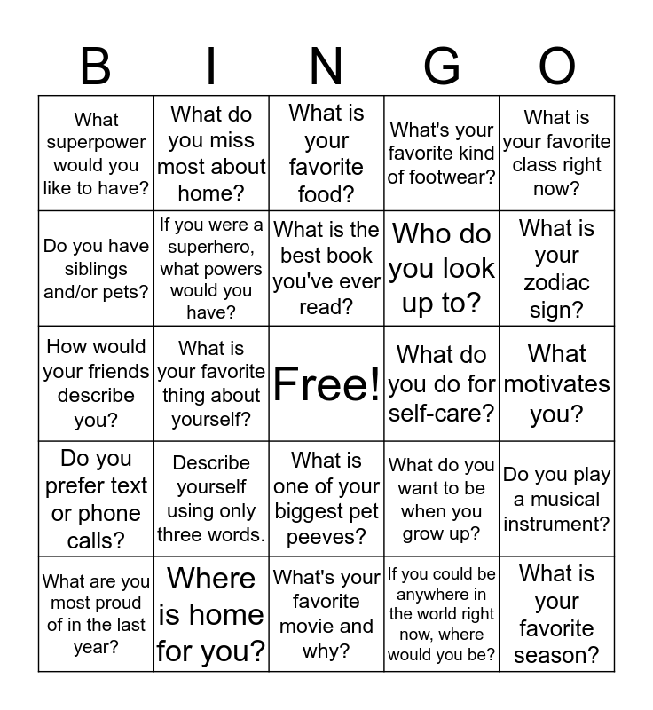 This bingo card has a free space and 24 words: Describe yourself using only three words., Where is home for you?, What is the best book you've ever read?, What are you most proud of in the last year?, What is your favorite class right now?, What superpower would you like to have?, Do you have siblings and/or pets?, What do you miss most about home?, What do you do for self-care?, What is one of your biggest pet peeves?, Who do you look up to?, How would your friends describe you?, What do you want to be when you grow up?, Do you play a musical instrument?, If you were a superhero, what powers would you have?, If you could be anywhere in the world right now, where would you be?, What motivates you?, What is your favorite food?, What is your zodiac sign?, What is your favorite thing about yourself?, What is your favorite season?, Do you prefer text or phone calls?, What's your favorite kind of footwear? and What's your favorite movie and why?.