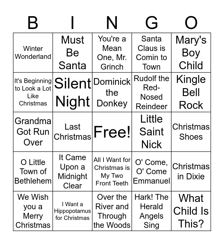 This bingo card has a free space and 87 words: O' Come, All Ye Faithful, All I Want for Christmas is You, All I Want for Christmas is My Two Front Teeth, Angels Among Us, Angels We Have Heard on High, Away in a Manger, Baby, It's Cold Outside, Blue Christmas, Boogie Woogie Santa Claus, Carol of the Bells, Christmas Don't Be Late, Christmas Carol, Christmas in Dixie, Christmas Shoes, Deck the Halls, Dominick the Donkey, 12 Days of Christmas, Feliz Navidad, The First Noel, Frosty the Snowman, Go Tell it on the Mountain, God Rest Ye Merry Gentleman, Grandma Got Run Over, Grown-Up Christmas List, Hark! The Herald Angels Sing, Have Yourself a Merry Little Christmas, Here Comes Santa Claus, Holly Jolly Christmas, I Saw Momma Kissing Santa Claus, I Saw 3 Ships, I Want a Hippopotamus for Christmas, I Wish it Could be Christmas Everyday, I'll Be Home for Christmas, It Came Upon a Midnight Clear, It's Beginning to Look a Lot Like Christmas, It's the Most Wonderful Time of the Year, Kingle Bell Rock, Jingle Bells, Joy to the World, Last Christmas, Let it Be Christmas, Let it Snow, Little Drummer Boy, Little Saint Nick, Mary, Did You Know, Mary's Boy Child, Mele Kalikimaka, Must Be Santa, My Favorite Things, Nutcracker Suite, O Come All Ye Faithful, O Holy Night, O Little Town of Bethlehem, O Tannenbaum, Pretty Paper, Rockin' Around the Christmas Tree, Rudolf the Red-Nosed Reindeer, Run Rudolph Run, Santa Baby, Santa Claus is Comin to Town, Silent Night, Silver and Gold, Silver Bells, Home for the Holidays, This Christmas, Up on the House Top, We Three Kings, We Wish you a Merry Christmas, What Child Is This?, Where Are You Christmas?, White Christmas, Blue Christmas, You're a Mean One, Mr. Grinch, O' Come, O' Come Emmanuel, Angels From the Realms of Glory, Let It Snow, Jolly Old St Nicholas, Over the River and Through the Woods, Do You Want to Build a Snowman?, Zat You Santa Claus, The Christmas Song, Dance of the Sugar Plum Fairy, He Shall Reign Forevermore, Do You Hear What I Hear?, Linus and Lucy, Winter Wonderland and National Lampon's Christmas Vacation Theme.