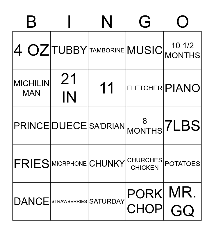 This bingo card has a free space and 33 words: BSA, NOVEMBER, 11, 2017, 7LBS, 4 OZ, 21 IN, SATURDAY, FLETCHER, MR. GQ, MICHILIN MAN, TUBBY, PORK CHOP, PREACHER, PRINCE, DUECE, CHUNKY, CHURCHES CHICKEN, POTATOES, FRIES, STRAWBERRIES, MOMMA, MUSIC, PIANO, DRUMS, MICRPHONE, TAMBORINE, 8 MONTHS, 10 1/2 MONTHS, DANCE, WORD PARTY, PRINCESS & THE FROG and BOLT.