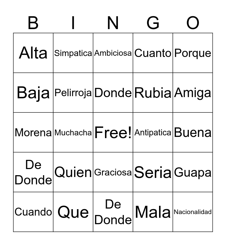 This bingo card has a free space and 24 words: Quien, Que, Donde, Cuando, Porque, Alta, Baja, Simpatica, Antipatica, Graciosa, Rubia, Morena, Seria, Guapa, Pelirroja, Mala, Buena, Ambiciosa, Amiga, Muchacha, Nacionalidad, De Donde, Cuanto and De Donde.