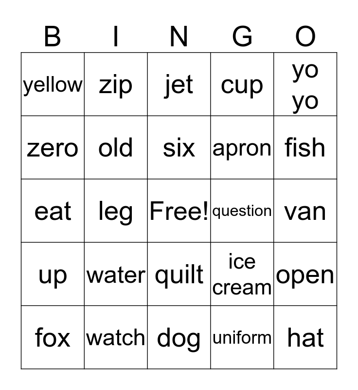 This bingo card has a free space and 24 words: water, watch, six, fox, yo yo, yellow, zero, zip, question, quilt, apron, eat, ice cream, open, old, uniform, van, jet, fish, leg, hat, up, cup and dog.
