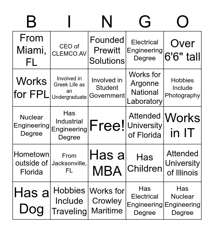 This bingo card has a free space and 27 words: Has Children, Lives outside Florida, Works for Argonne National Laboratory, Works for Crowley Maritime, Works for FPL, Founded Prewitt Solutions, CEO of CLEMCO.AV, Hometown outside of Florida, Attended University of Florida, Attended University of Illinois, Nuclear Engineering Degree, Electrical Engineering Degree, Has a Dog, Hobbies Include Traveling, Hobbies Include Photography, Involved in NSBE as an Undergraduate, Involved in Greek Life as an Undergraduate, Involved in Student Government, From Jacksonville, FL, From Miami, FL, Works in IT, Has Electrical Engineering Degree, Has Industrial Engineering Degree, Has Nuclear Engineering Degree, Has a MBA, Over 6'6" tall and Married.