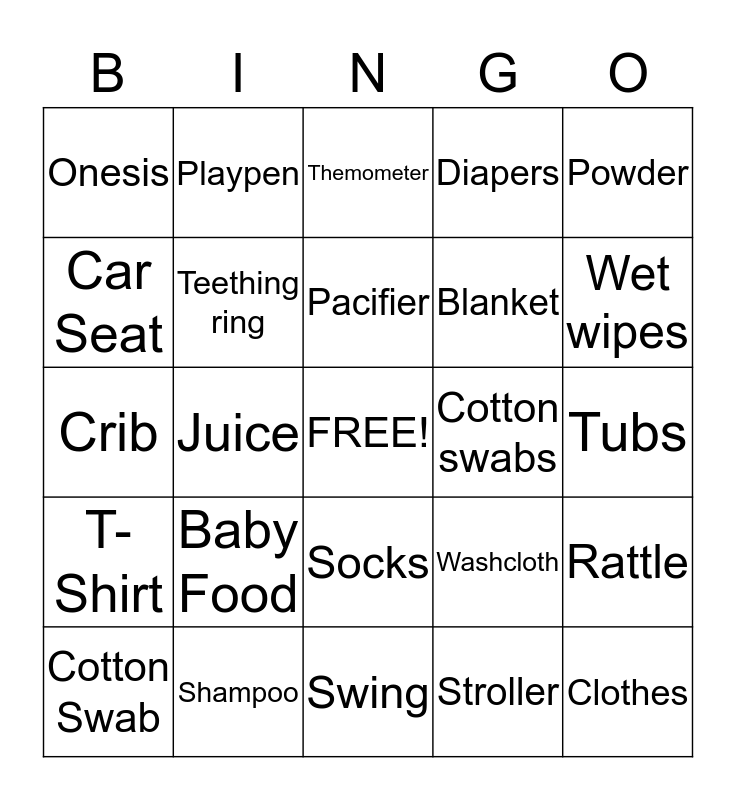 This bingo card has a free space and 24 words: Baby Food, Shampoo, Pacifier, Cotton Swab, Powder, Onesis, Car Seat, Playpen, Cotton swabs, Socks, Blanket, Crib, Washcloth, Rattle, Teething ring, Stroller, Tubs, Themometer, Wet wipes, Juice, Clothes, T-Shirt, Diapers and Swing.