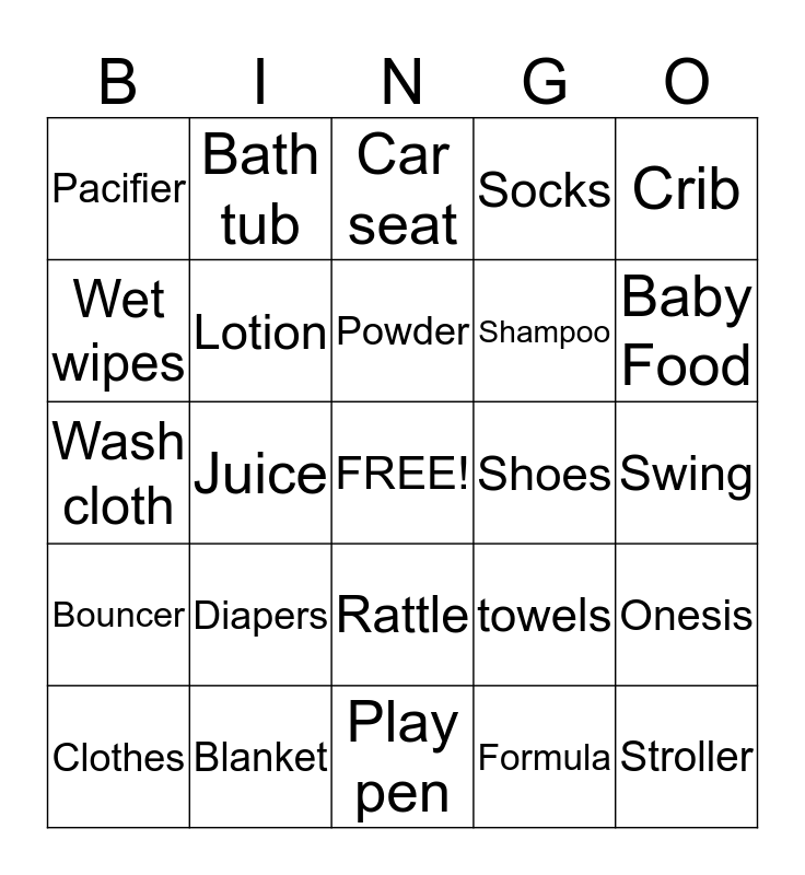 This bingo card has a free space and 24 words: Diapers, Blanket, Powder, Clothes, Crib, Pacifier, Wet wipes, Bath tub, Shoes, Rattle, Shampoo, Wash cloth, towels, Onesis, Lotion, Formula, Swing, Car seat, Baby Food, Juice, Stroller, Bouncer, Socks and Play pen.