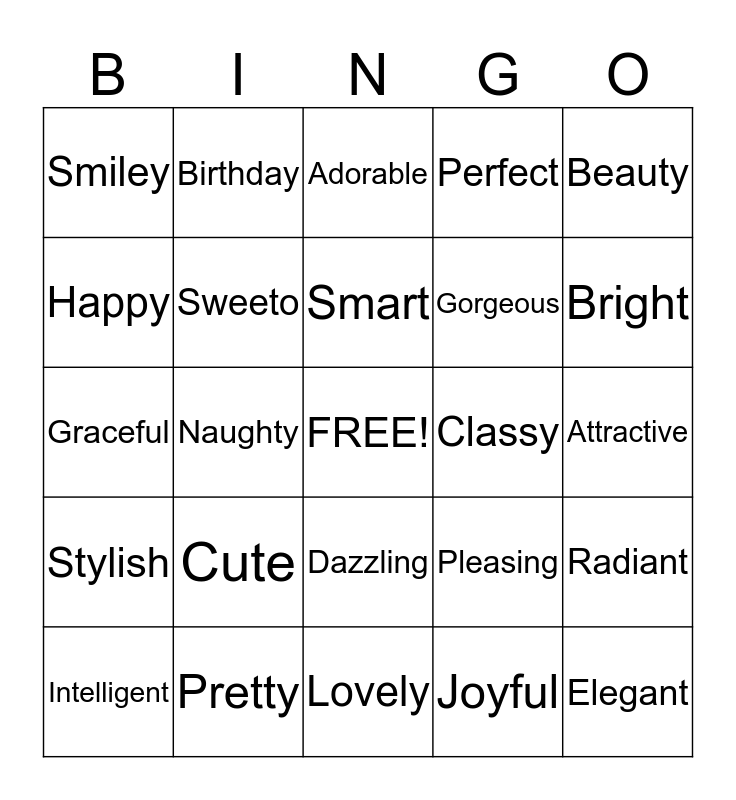 This bingo card has a free space and 24 words: Cute, Pretty, Smart, Intelligent, Beauty, Smiley, Happy, Birthday, Classy, Dazzling, Gorgeous, Graceful, Pleasing, Radiant, Sweeto, Joyful, Attractive, Adorable, Bright, Naughty, Elegant, Stylish, Perfect and Lovely.