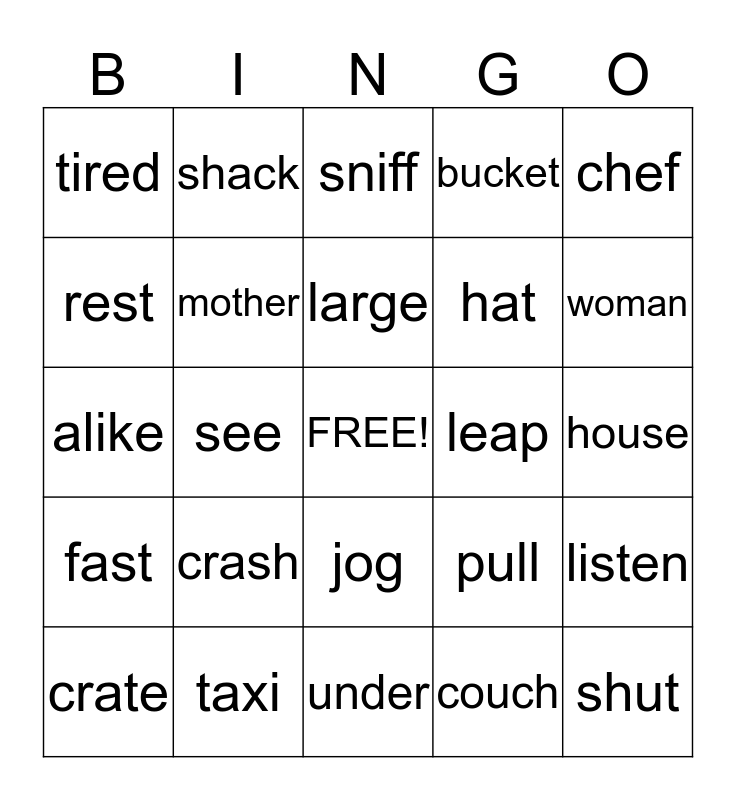 This bingo card has a free space and 24 words: crash, taxi, large, crate, chef, tired, rest, shack, leap, jog, hat, alike, pull, listen, mother, couch, house, sniff, woman, see, shut, fast, bucket and under.