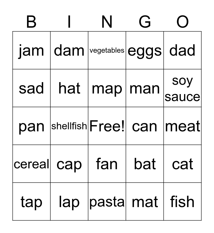 This bingo card has a free space and 24 words: cap, lap, map, tap, dad, jam, sad, dam, can, fan, man, pan, bat, cat, hat, mat, meat, vegetables, soy sauce, shellfish, fish, cereal, eggs and pasta.