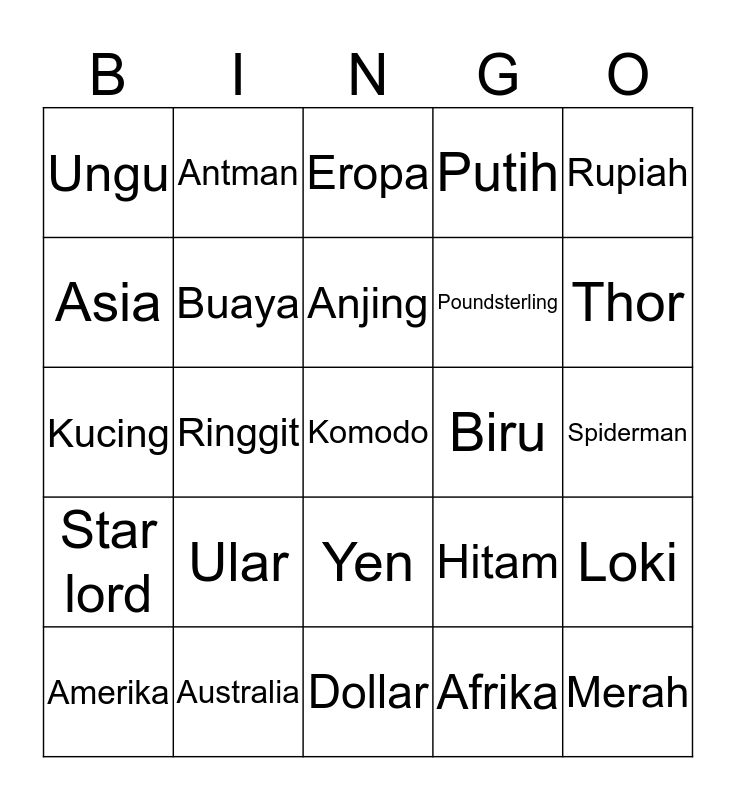This bingo card has 25 words: Ular, Dollar, Anjing, Amerika, Rupiah, Ungu, Asia, Antman, Biru, Yen, Poundsterling, Kucing, Hitam, Loki, Buaya, Merah, Spiderman, Eropa, Thor, Ringgit, Komodo, Australia, Star lord, Putih and Afrika.