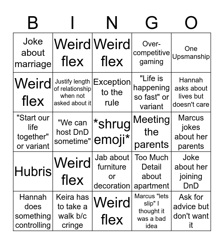 This bingo card has a free space and 24 words: Weird flex, Keira has to take a walk b/c cringe, Exception to the rule, Hannah does something controlling, One Upsmanship, Joke about marriage, Weird flex, Weird flex, Meeting the parents, Jab about furniture or decoration, "Life is happening so fast" or variant, "Start our life together" or variant, Too Much Detail about apartment, Joke about her joining DnD, Justify length of relationship when not asked about it, Marcus "lets slip" I thought it was a bad idea, Marcus jokes about her parents, Weird flex, Hannah asks about lives but doesn't care, "We can host DnD sometime", Ask for advice but don't want it, Hubris, Over-competitive gaming and Weird flex.