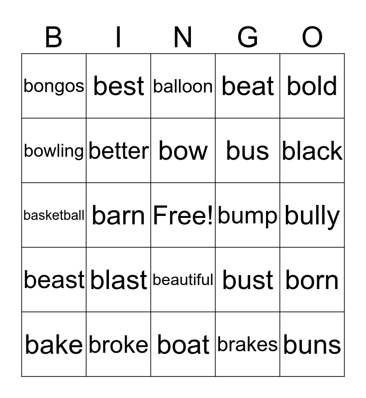 This bingo card has a free space and 56 words: bingo, bake, bank, bongos, boat, bed, better, butter, bus, bike, beat, bull, ball, bill, baby, banjo, bold, barn, boogie, buns, bump, bugle, bust, balloon, baseball, bow, bye, back, black, bear, brown, blue, bubble, blow, bully, bowling, basketball, beef, beast, best, beautiful, baker, bite, bean, burp, blast, broke, boom, book, bone, brakes, beautiful, breakfast, bored, born and bark.