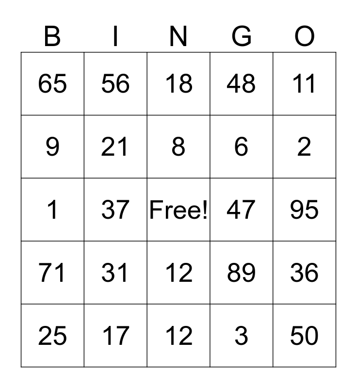 This bingo card has a free space and 24 words: 31, 17, 8, 25, 11, 65, 9, 56, 47, 12, 6, 1, 89, 36, 21, 3, 95, 18, 2, 37, 50, 71, 48 and 12.