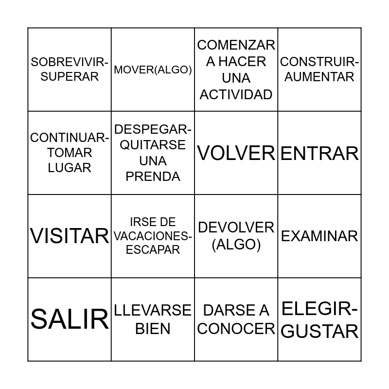 This bingo card has 36 words: CAZAR- SEGUIR, COMENZAR, IRSE, VOLVER, CAERSE AL PISO- DESCENDER, ELEGIR- GUSTAR, ENTRAR, EXPLOTAR-DEJAR DE FUNCIONAR, CONTINUAR-TOMAR LUGAR, SALIR- DEJAR DE QUEMAR, EXAMINAR, CONSTRUIR- AUMENTAR, DARSE A ENTENDER, LLEVARSE BIEN, IRSE DE VACACIONES- ESCAPAR, SOBREVIVIR-SUPERAR, DISMINUIR-ABOCARSE, INGRESAR- LLEGAR, SALIR, COMENZAR A HACER UNA ACTIVIDAD, DARSE A CONOCER, RECUPERARSE DE UNA ENFERMEDAD O PROBLEMA, TERMINAR ALGO EXITOSAMENTE, LEVANTARSE DE LA CAMA- PARARSE, PARECER, MOVER(ALGO), DEVOLVER (ALGO), TOMAR NOTA, VISITAR, DESPEGAR-QUITARSE UNA PRENDA, ACEPTAR UN TRABAJO O RESPONSABILIDAD, INVITAR Y PAGAR, TOMAR EL CONTROL, COMENAR UNA ACTIVIDAD QUE TE GUSTA, MOSTRAR(LUGAR) and COMENZAR UN TRABAJO.