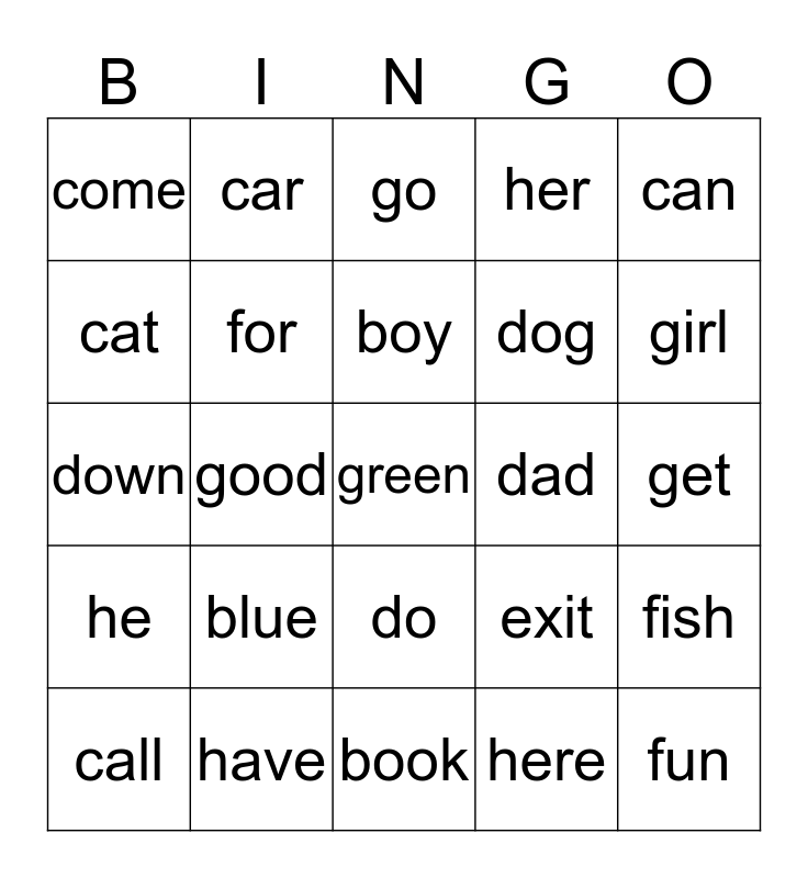 This bingo card has 25 words: blue, book, boy, call, can, come, cat, car, dad, do, dog, down, exit, fish, for, fun, get, go, girl, good, green, have, he, her and here.