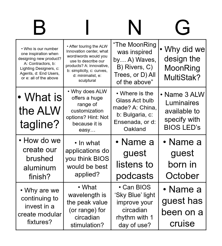 This bingo card has 18 words: • In what applications do you think BIOS would be best applied?, • Name a guest has been on a cruise, “The MoonRing was inspired by… A) Waves, B) Rivers, C) Trees, or D) All of the above”, • Who is our number one inspiration when designing new product? A: Contractors, b: Lighting Designers, c: Agents, d: End Users, or e: all of the above, • Name a guest listens to podcasts, • Why did we design the MoonRing MultiStak?, • Why are we continuing to invest in a create modular fixtures?, • After touring the ALW Innovation center, what word/words would you use to describe our products? A: innovative, b: simplicity, c: curves, d: minimalist, e: sculptural, • Name 3 ALW Luminaires available to specify with BIOS LED’s, • How do we create our brushed aluminum finish?, • Can BIOS ‘Sky Blue’ light improve your circadian rhythm with 1 day of use?, • What is the ALW tagline?, • Name a guest born in October, • Why does ALW offers a huge range of customization options? Hint: Not because it is easy…, • Where is the Glass Act bulb made? A: China, b: Bulgaria, c: Ensenada, or d: Oakland, • What is the difference between tunable white and BIOS light?, • What wavelength is the peak value (or range) for circadian stimulation? and • What can disrupt circadian rhythm? A: blue light, b: social pressures, c: Monday night football, d: all of the above.