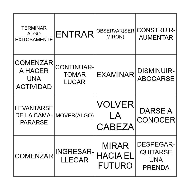 This bingo card has 48 words: CAZAR- SEGUIR, COMENZAR, IRSE, VOLVER, CAERSE AL PISO- DESCENDER, ELEGIR- GUSTAR, ENTRAR, EXPLOTAR-DEJAR DE FUNCIONAR, CONTINUAR-TOMAR LUGAR, SALIR- DEJAR DE QUEMAR, EXAMINAR, CONSTRUIR- AUMENTAR, DARSE A ENTENDER, LLEVARSE BIEN, IRSE DE VACACIONES- ESCAPAR, SOBREVIVIR-SUPERAR, DISMINUIR-ABOCARSE, INGRESAR- LLEGAR, SALIR, COMENZAR A HACER UNA ACTIVIDAD, DARSE A CONOCER, RECUPERARSE DE UNA ENFERMEDAD O PROBLEMA, TERMINAR ALGO EXITOSAMENTE, LEVANTARSE DE LA CAMA- PARARSE, PARECER, MOVER(ALGO), DEVOLVER (ALGO), TOMAR NOTA, VISITAR, DESPEGAR-QUITARSE UNA PRENDA, ACEPTAR UN TRABAJO O RESPONSABILIDAD, INVITAR Y PAGAR, TOMAR EL CONTROL, COMENAR UNA ACTIVIDAD QUE TE GUSTA, MOSTRAR(LUGAR), COMENZAR UN TRABAJO, CUIDAR, MIRAR HACIA EL FUTURO, RECORDAR-REMEMORAR, BUSCAR (ALGO), ESPERAR (FUTURO), VISITAR(PERSONA), OBSERVAR(SER MIRON), ESTAR ATENTO, VOLVER LA CABEZA, CONFIAR- ACUDIR, HOJEAR and AVERIGUAR.