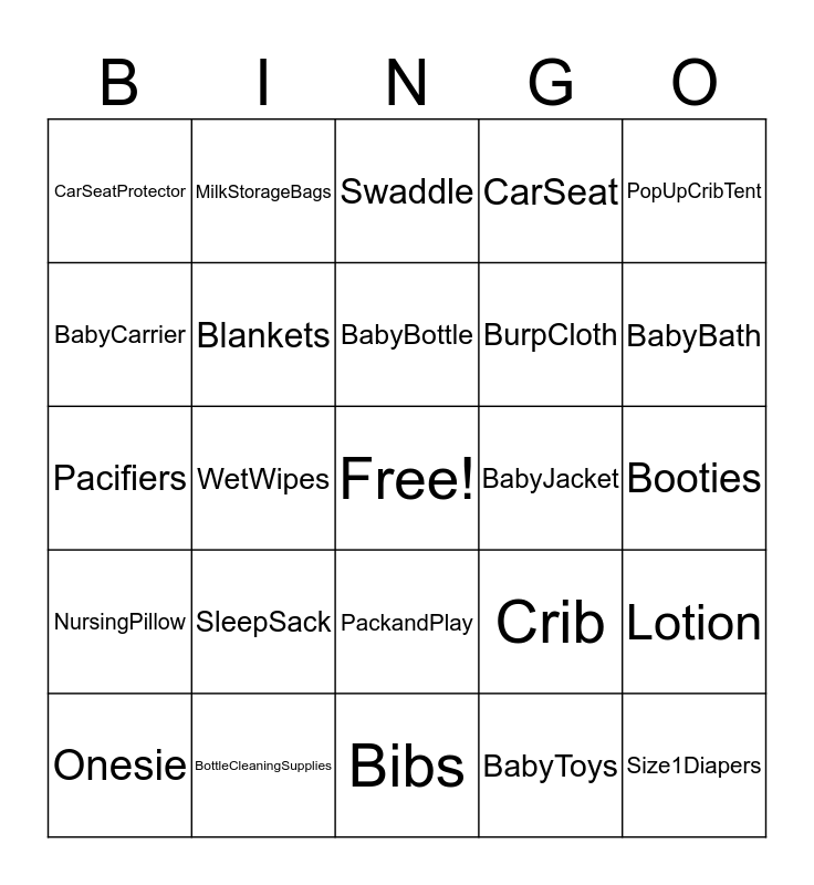 This bingo card has a free space and 25 words: SleepSack, Bibs, BabyBottle, Onesie, PopUpCribTent, CarSeatProtector, BabyCarrier, MilkStorageBags, BabyJacket, PackandPlay, BurpCloth, Pacifiers, Crib, Lotion, Blankets, ChangingPad, Booties, Swaddle, BabyBath, WetWipes, Size1Diapers, BottleCleaningSupplies, NursingPillow, CarSeat and BabyToys.