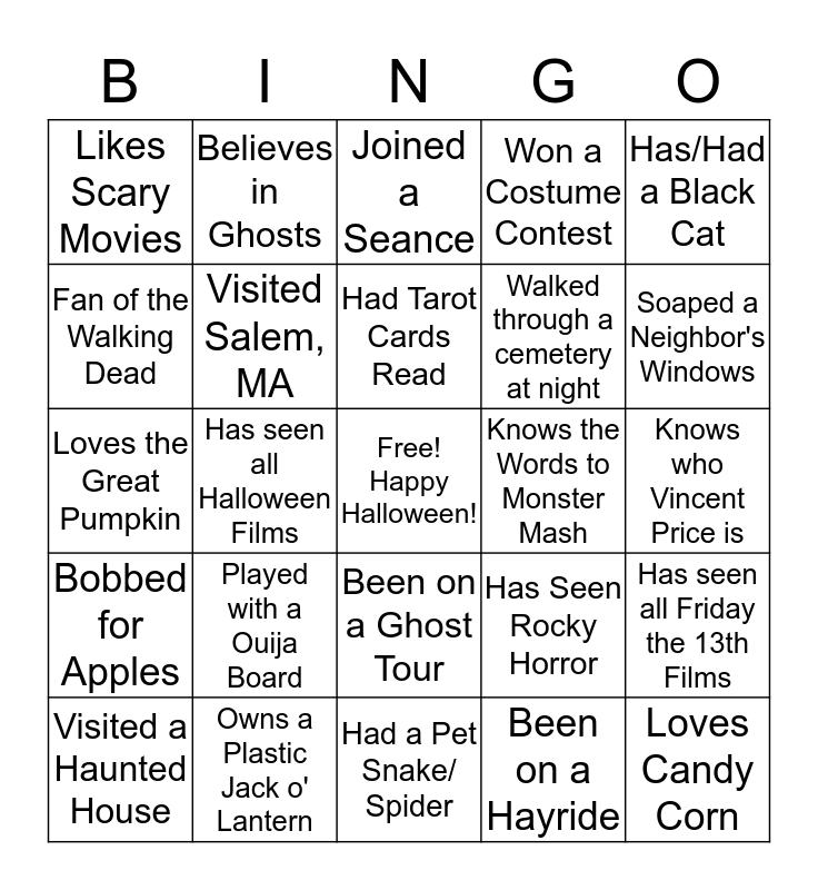 This bingo card has a free space and 34 words: Toilet Papered a House, Been on a Hayride, Got Lost in a Corn Maze, Born in October, Bobbed for Apples, Visited Salem, MA, Has/Had a Black Cat, Visited a Haunted House, Believes in Ghosts, Had their Palm Read, Had Tarot Cards Read, Joined a Seance, Ate your kids' Halloween candy, Can do the Thriller Dance, Knows the Words to Monster Mash, Soaped a Neighbor's Windows, Owns a Plastic Jack o' Lantern, Loves the Great Pumpkin, Played with a Ouija Board, Has Seen Rocky Horror, Been on a Ghost Tour, Carves Pumpkins, Likes Scary Movies, Knows who Vincent Price is, Had a Pet Snake/ Spider, Loves Candy Corn, Won a Costume Contest, Still Goes Trick or Treating, Walked through a cemetery at night, Fan of the Walking Dead, Has seen all Harry Potter films, Has seen all Halloween Films, Has seen all Friday the 13th Films and Is a Zombie Before Coffee.