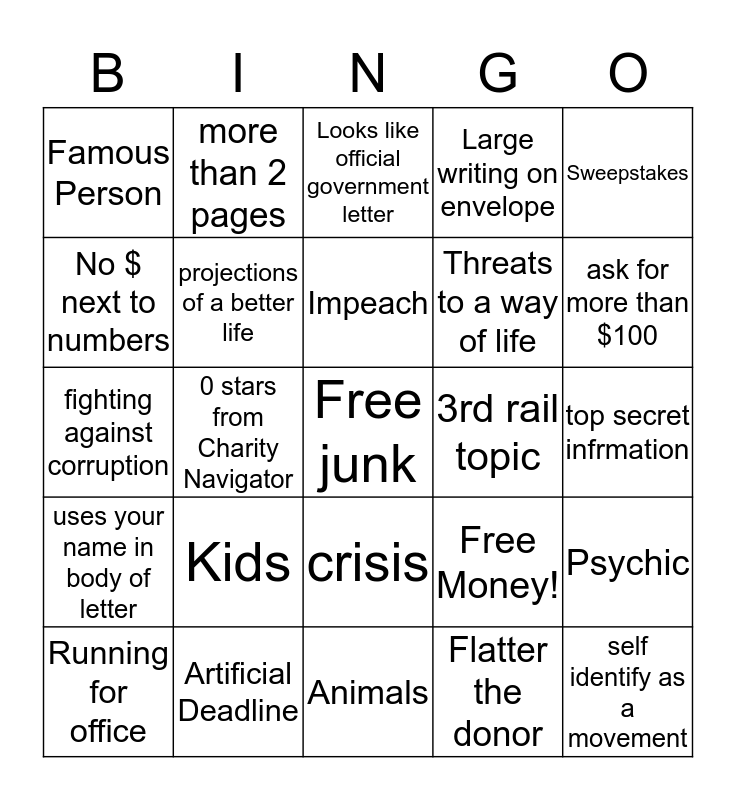 This bingo card has 25 words: Kids, Animals, Impeach, Running for office, Sweepstakes, Famous Person, No $ next to numbers, more than 2 pages, 3rd rail topic, crisis, Threats to a way of life, fighting against corruption, Free Money!, Psychic, projections of a better life, self identify as a movement, top secret infrmation, Looks like official government letter, ask for more than $100, 0 stars from Charity Navigator, Free junk, Artificial Deadline, uses your name in body of letter, Large writing on envelope and Flatter the donor.