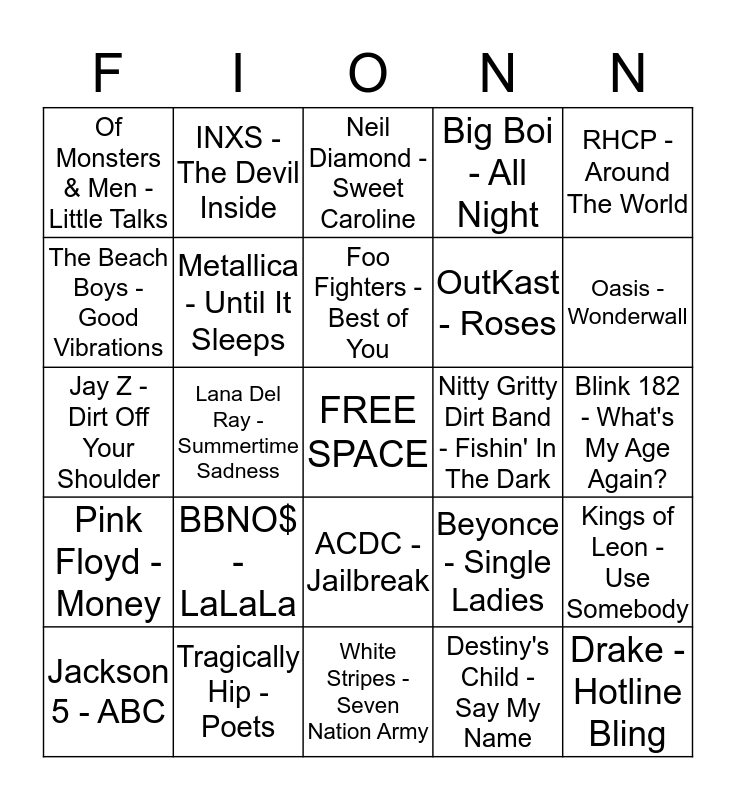 This bingo card has a free space and 24 words: BBNO$ -LaLaLa, Tragically Hip - Poets, Foo Fighters - Best of You, Jackson 5 - ABC, RHCP - Around The World, Of Monsters & Men - Little Talks, The Beach Boys - Good Vibrations, INXS - The Devil Inside, Nitty Gritty Dirt Band - Fishin' In The Dark, ACDC - Jailbreak, OutKast - Roses, Jay Z - Dirt Off Your Shoulder, Beyonce - Single Ladies, Kings of Leon - Use Somebody, Metallica - Until It Sleeps, Destiny's Child - Say My Name, Blink 182 - What's My Age Again?, Neil Diamond - Sweet Caroline, Oasis - Wonderwall, Lana Del Ray -Summertime Sadness, Drake - Hotline Bling, Pink Floyd - Money, Big Boi - All Night and White Stripes - Seven Nation Army.