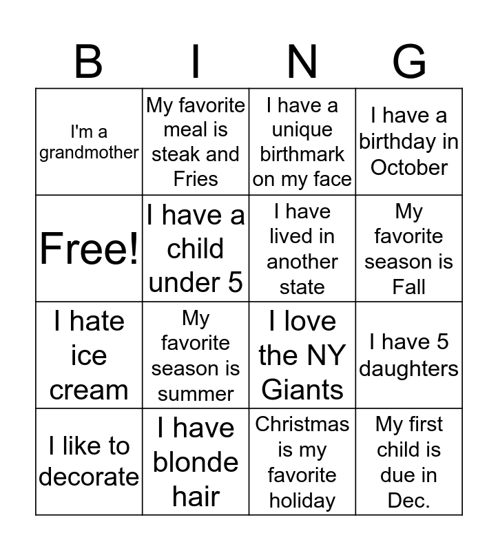 This bingo card has 16 words: I have blonde hair, I have 5 daughters, I have a unique birthmark on my face, I'm a grandmother, I hate ice cream, My favorite meal is steak and Fries, I love the NY Giants, Christmas is my favorite holiday, Free!, I have a child under 5, I like to decorate, I have a birthday in October, My favorite season is summer, My favorite season is Fall, I have lived in another state and My first child is due in Dec..