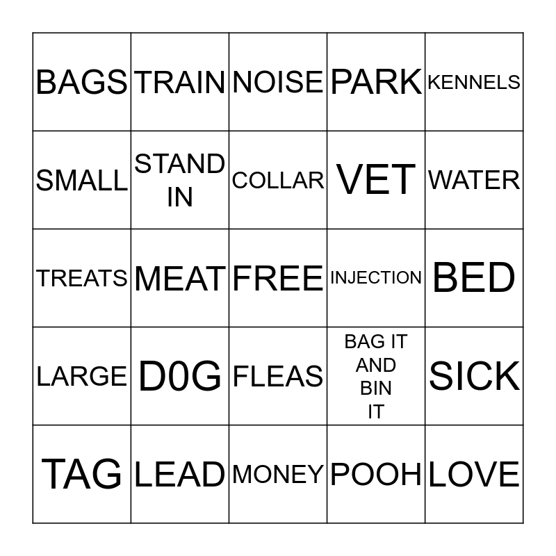This bingo card has a free space and 24 words: D0G, LEAD, COLLAR, TAG, KENNELS, BAGS, SMALL, TRAIN, INJECTION, FLEAS, VET, TREATS, BAG IT AND BIN IT, SICK, STAND IN, POOH, BED, NOISE, WATER, MEAT, LOVE, LARGE, PARK and MONEY.