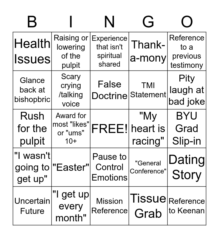 This bingo card has a free space and 24 words: "Easter", "I get up every month", False Doctrine, Uncertain Future, Reference to a previous testimony, Health Issues, Glance back at bishopbric, Raising or lowering of the pulpit, "My heart is racing", Pause to Control Emotions, TMI Statement, Rush for the pulpit, "General Conference", Dating Story, Scary crying /talking voice, Tissue Grab, BYU Grad Slip-in, Experience that isn't spiritual shared, Pity laugh at bad joke, Award for most "likes" or "ums" 10+, Reference to Keenan, "I wasn't going to get up", Thank-a-mony and Mission Reference.