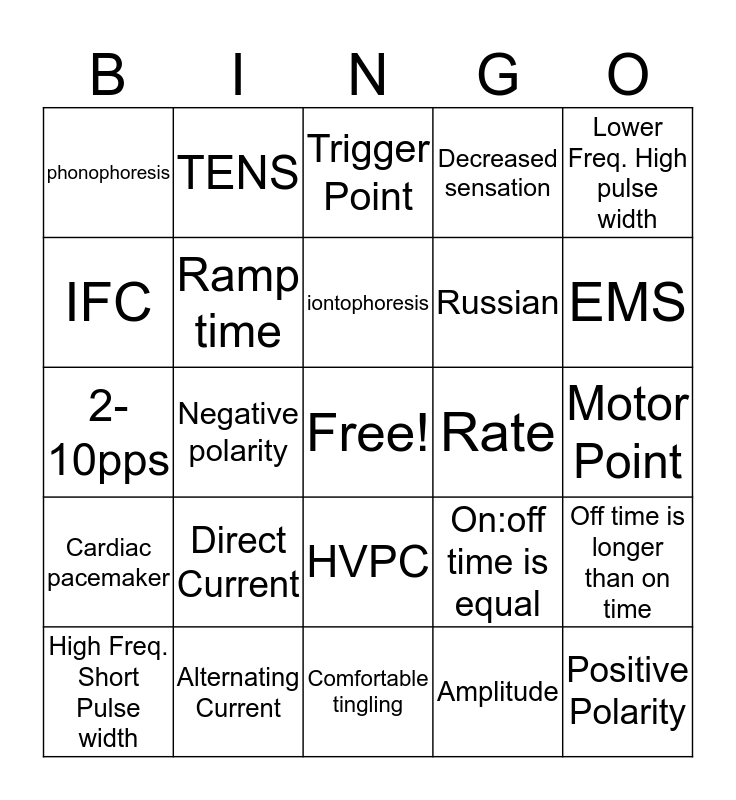 This bingo card has a free space and 24 words: Direct Current, Alternating Current, iontophoresis, High Freq. Short Pulse width, Lower Freq. High pulse width, phonophoresis, IFC, TENS, Rate, HVPC, Russian, 2-10pps, On:off time is equal, Off time is longer than on time, Ramp time, Amplitude, Motor Point, Trigger Point, EMS, Negative polarity, Positive Polarity, Cardiac pacemaker, Decreased sensation and Comfortable tingling.