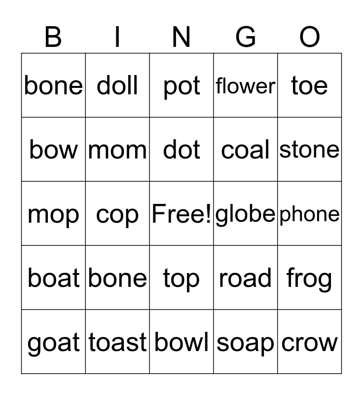 This bingo card has a free space and 29 words: goat, toe, cop, dog, bone, pot, mom, bone, globe, toast, phone, crow, bowl, soap, stone, cone, top, boat, toe, mop, road, oak, coal, bow, flower, doll, frog, dot and tone.