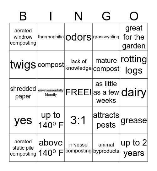 This bingo card has a free space and 55 words: vermicomposting, aerated static pile composting, onsite composting, aerated windrow composting, in-vessel composting, backyard composting, compost, natural composting, mature compost, castings, grasscycling, mulch, browns, greens, water, saves money, great for the garden, environmentally friendly, vermicomposting & backyard composting, up to 2 years, as little as a few weeks, as little as 3 months, attracts pests, odors, location, lack of knowledge, animal byproducts, eggs, dairy, grease, grass clippings, food scraps, coffee grounds, leaves, twigs, shredded paper, in-vessel & aerated windrow composting, yes, 3 lbs, mesophilic, thermophilic, maturation, up to 40⁰ C, above 40⁰ C, up to 140⁰ F, above 140⁰ F, break down the tougher debri, Yellowstone, forest floor, rotting logs, false, true, mesophilic & maturation, 3:1 and false.