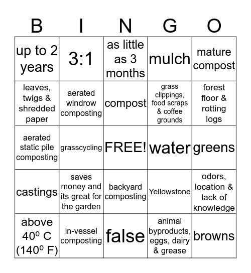 This bingo card has a free space and 40 words: vermicomposting, aerated static pile composting, onsite composting, aerated windrow composting, in-vessel composting, backyard composting, compost, natural composting, mature compost, castings, grasscycling, mulch, browns, greens, water, saves money and its great for the garden, vermicomposting & backyard composting, up to 2 years, as little as a few weeks, as little as 3 months, odors, location & lack of knowledge, animal byproducts, eggs, dairy & grease, grass clippings, food scraps & coffee grounds, leaves, twigs & shredded paper, in-vessel & aerated windrow composting, yes, 3 lbs, mesophilic, thermophilic, maturation, up to 40⁰ C (140⁰ F), above 40⁰ C (140⁰ F), break down the tougher debri, Yellowstone, forest floor & rotting logs, false, true, mesophilic & maturation, 3:1 and false.