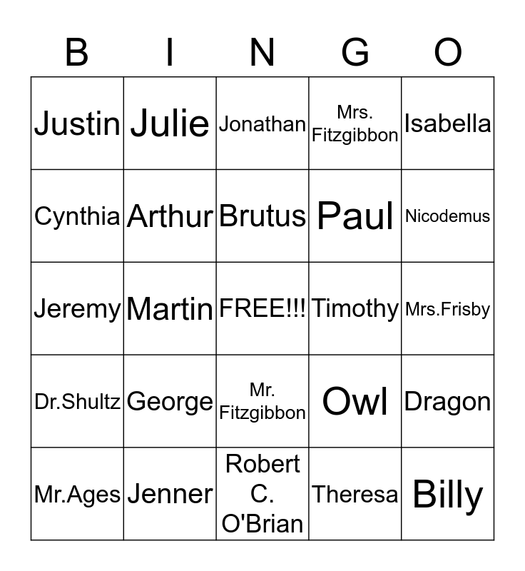 This bingo card has a free space and 24 words: George, Jenner, Brutus, Mr.Ages, Isabella, Justin, Cynthia, Julie, Timothy, Mr. Fitzgibbon, Paul, Jeremy, Owl, Dragon, Arthur, Theresa, Mrs.Frisby, Jonathan, Nicodemus, Martin, Billy, Dr.Shultz, Mrs. Fitzgibbon and Robert C. O'Brian.