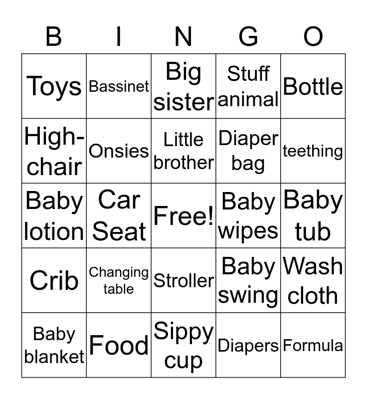 This bingo card has a free space and 32 words: Diapers, Pacifier, Car Seat, Baby Wash, Crib, Onsies, Bottle, Wash cloth, Bassinet, Baby powder, Little brother, Big sister, Baby monitor, Bib, Baby wipes, Burp cloth, Baby blanket, Baby lotion, Stroller, Changing table, Baby swing, mittens, Baby tub, Food, Formula, Stuff animal, Diaper bag, High-chair, Toys, Sippy cup, Baby shampoo and teething.
