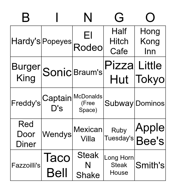 This bingo card has a free space and 24 words: Wendys, Taco Bell, Braum's, Fazzoilli's, Hong Kong Inn, Hardy's, Burger King, Popeyes, Subway, Mexican Villa, Pizza Hut, Freddy's, Ruby Tuesday's, Apple Bee's, Sonic, Long Horn Steak House, Dominos, El Rodeo, Little Tokyo, Captain D's, Smith's, Red Door Diner, Half Hitch Cafe and Steak N Shake.
