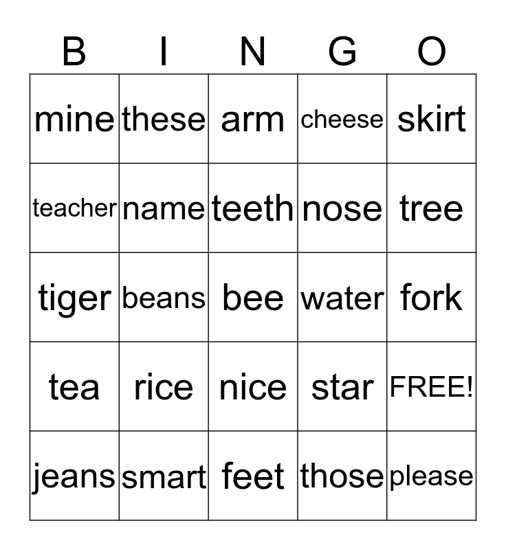 This bingo card has 28 words: FREE!, game, nose, those, teacher, arm, these, tea, water, jeans, tiger, cheese, smart, feet, tree, coffee, rice, name, teeth, nice, mine, please, bee, beans, fork, star, skirt and bird.