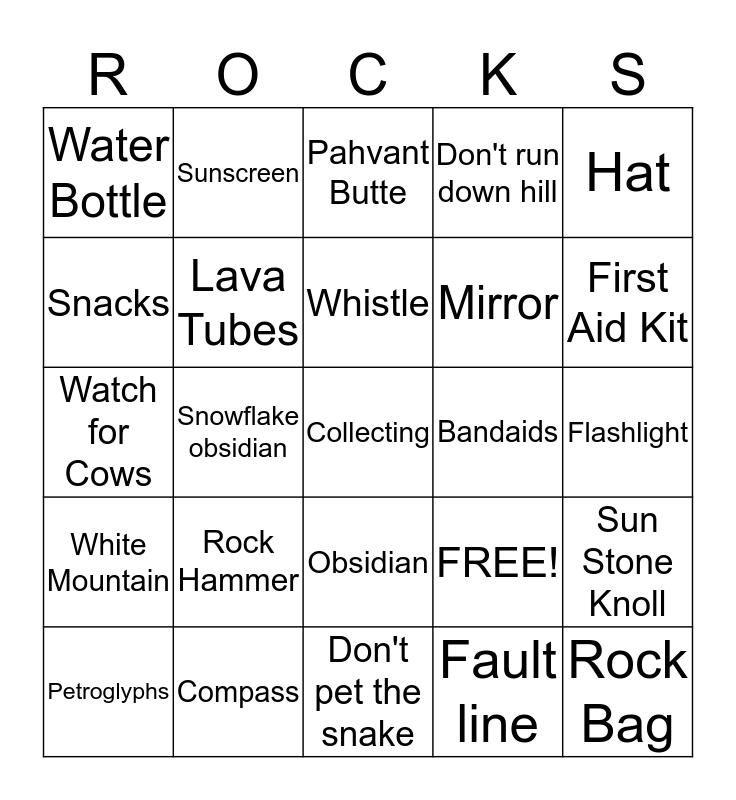 This bingo card has 25 words: Rock Hammer, Don't pet the snake, Whistle, Petroglyphs, Hat, Water Bottle, Snacks, Sunscreen, Bandaids, Obsidian, Mirror, Watch for Cows, FREE!, Sun Stone Knoll, Lava Tubes, Rock Bag, Flashlight, Pahvant Butte, First Aid Kit, Snowflake obsidian, Collecting, Compass, White Mountain, Don't run down hill and Fault line.