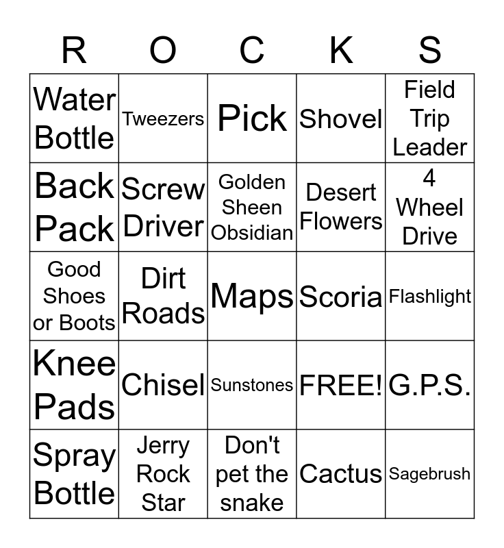 This bingo card has 25 words: Chisel, Don't pet the snake, Golden Sheen Obsidian, Spray Bottle, Field Trip Leader, Water Bottle, Back Pack, Tweezers, Scoria, Sunstones, Desert Flowers, Good Shoes or Boots, FREE!, G.P.S., Screw Driver, Sagebrush, Flashlight, Pick, 4 Wheel Drive, Dirt Roads, Maps, Jerry Rock Star, Knee Pads, Shovel and Cactus.
