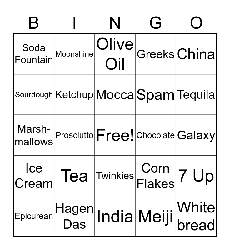This bingo card has a free space and 24 words: Tea, Hagen Das, Mocca, Epicurean, China, Soda Fountain, Sourdough, Moonshine, Chocolate, Twinkies, Spam, Marsh-mallows, Corn Flakes, 7 Up, Ketchup, Meiji, Galaxy, Olive Oil, Tequila, Prosciutto, White bread, Ice Cream, Greeks and India.