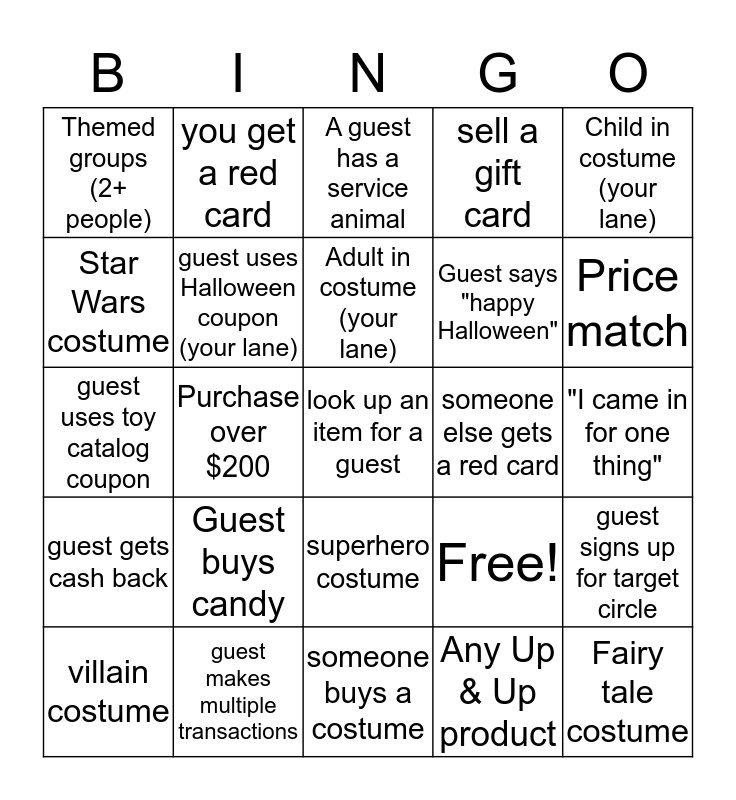 This bingo card has 25 words: Guest buys candy, someone buys a costume, Adult in costume (your lane), villain costume, Child in costume (your lane), Themed groups (2+ people), Star Wars costume, you get a red card, someone else gets a red card, superhero costume, Guest says "happy Halloween", guest uses toy catalog coupon, Free!, guest signs up for target circle, guest uses Halloween coupon (your lane), Fairy tale costume, "I came in for one thing", A guest has a service animal, Price match, Purchase over $200, look up an item for a guest, guest makes multiple transactions, guest gets cash back, sell a gift card and Any Up & Up product.