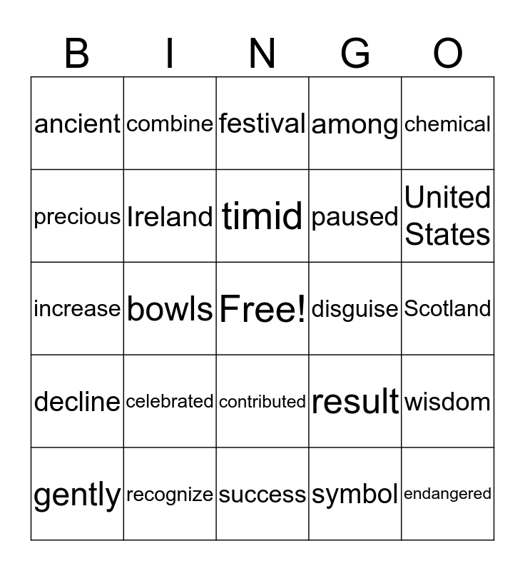 This bingo card has a free space and 29 words: gently, outlined, bowls, origin, ancient, festival, Ireland, celebrated, disguise, recognize, Scotland, endangered, success, symbol, United States, continental, contributed, decline, chemical, increase, result, pollution, paused, precious, among, combine, wisdom, timid and depth.