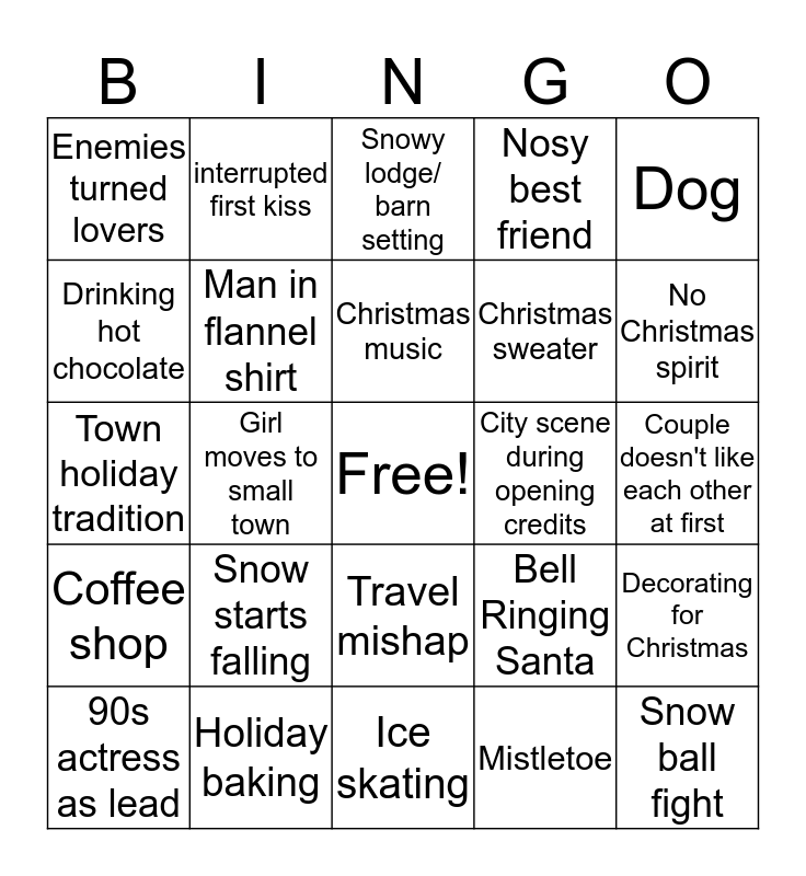 This bingo card has a free space and 29 words: 90s actress as lead, Santa Sighting!, Girl moves to small town, Garland.... everywhere, Enemies turned lovers, Snowy lodge/ barn setting, Man in flannel shirt, Snow starts falling, City scene during opening credits, Holiday baking, Couple doesn't like each other at first, Snow ball fight, Ice skating, Mistletoe, No Christmas spirit, Returns to hometown, Travel mishap, Coffee shop, Dog, Town holiday tradition, Bell Ringing Santa, Obvious fake snow, Christmas sweater, Drinking hot chocolate, Nosy best friend, interrupted first kiss, Decorating for Christmas, Christmas music and Characters collide.