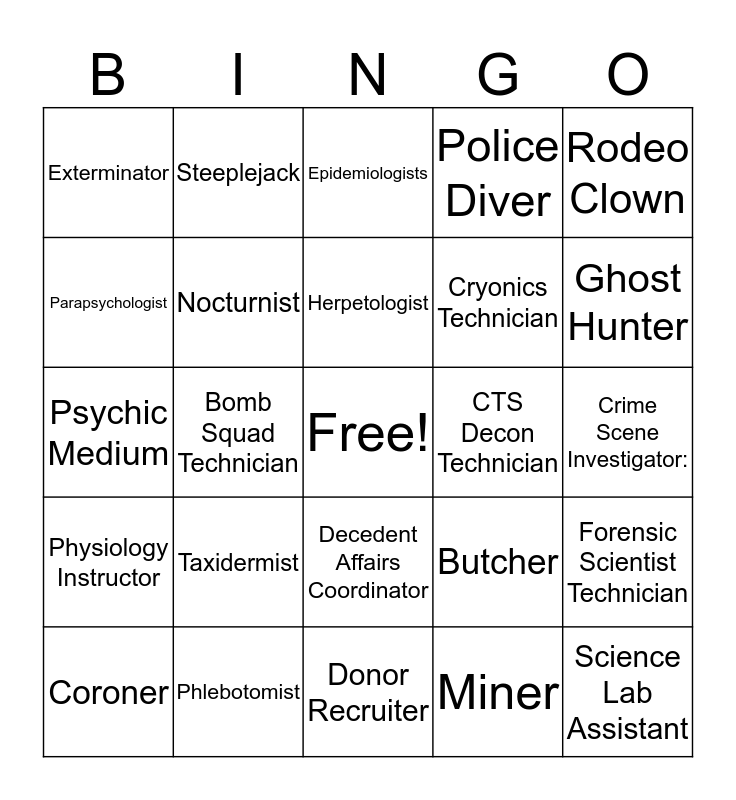 This bingo card has a free space and 29 words: Coroner, Mortician, Bomb Squad Technician, Entomologist, Exterminator, Epidemiologists, Nocturnist, Taxidermist, CTS Decon Technician, Phlebotomist, Crime Scene Investigator:, Science Lab Assistant, Donor Recruiter, Miner, Ghost Hunter, High-Rise Window Washer, Decedent Affairs Coordinator, Physiology Instructor, Rodeo Clown, Psychic Medium, Butcher, Aquarist, Cryonics Technician, Parapsychologist, Police Diver, Steeplejack, Forensic Scientist Technician, Herpetologist and Costume Specialist.