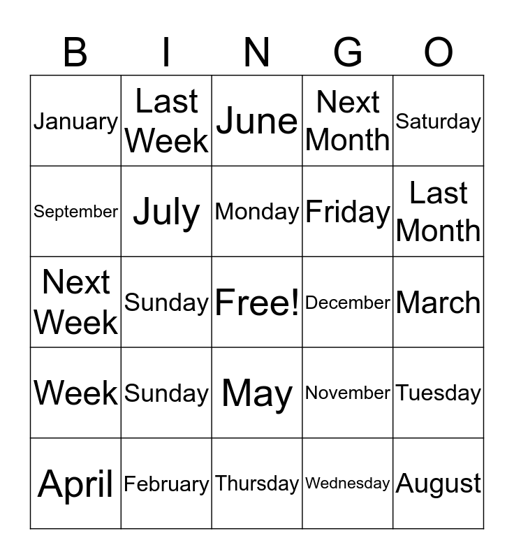 This bingo card has a free space and 24 words: Sunday, February, Monday, April, Saturday, January, September, Last Week, December, May, Friday, Next Week, November, Tuesday, July, Wednesday, March, June, Last Month, Sunday, August, Week, Next Month and Thursday.